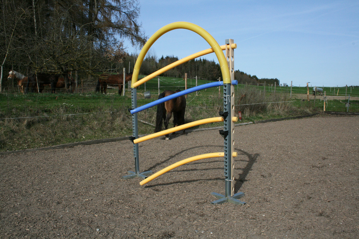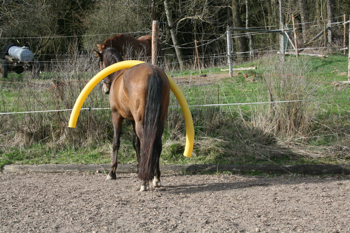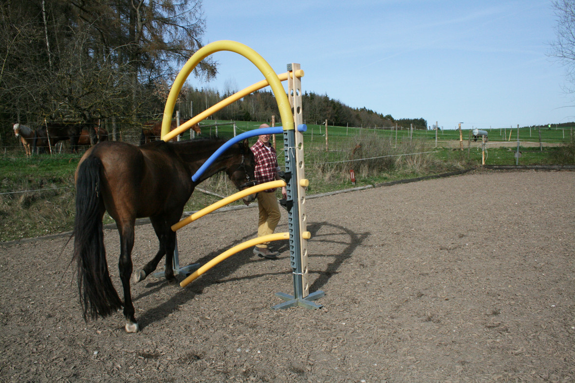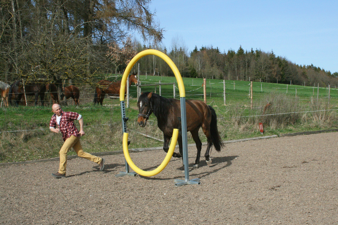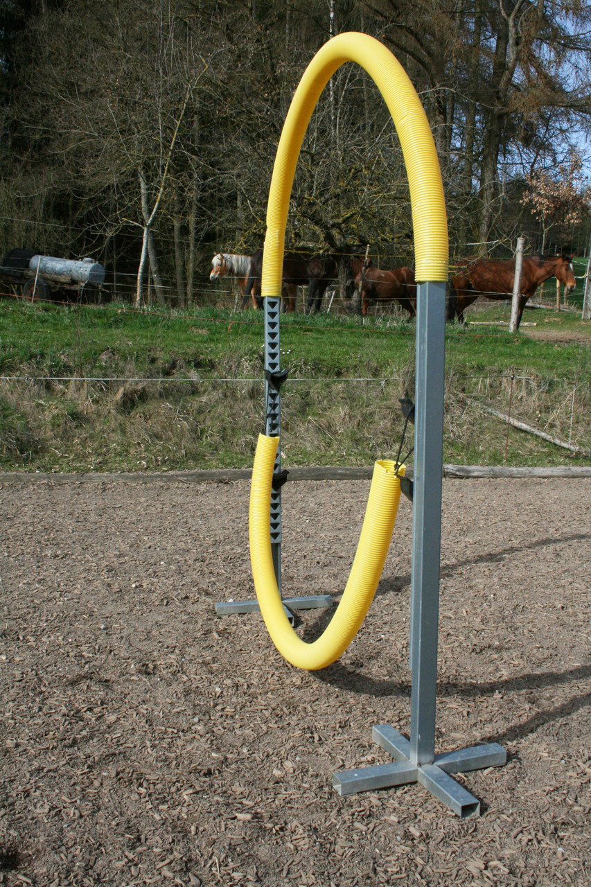 Bitte starten Sie aber langsam und beginnen Sie z.B. erst einmal nur mit dem Rohr am Boden liegend. Dann vielleicht  nur mit dem unteren Ring oder dem oberen Ring. Später, wenn das Pferd sicher ist, kann man den unteren Ring etwas höher hängen und wer sich dann noch traut auf dem Pferd durchspringen.