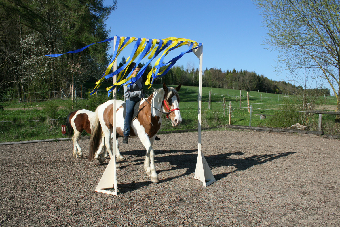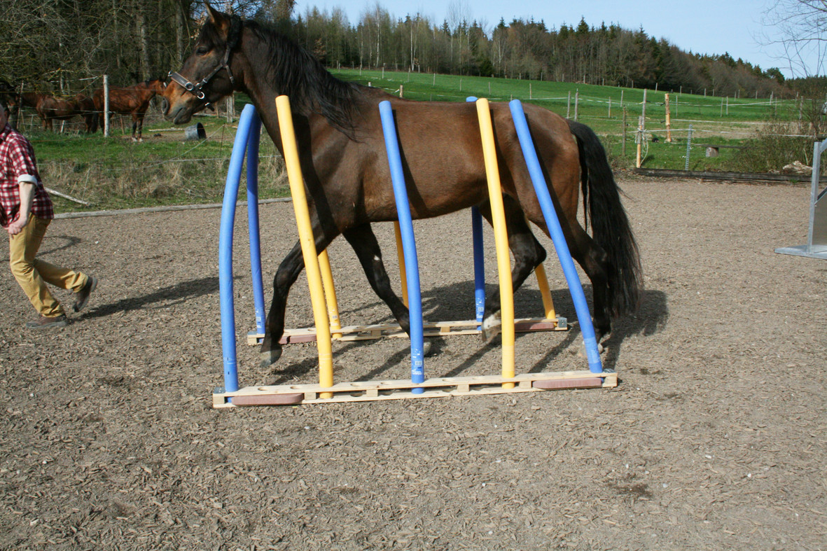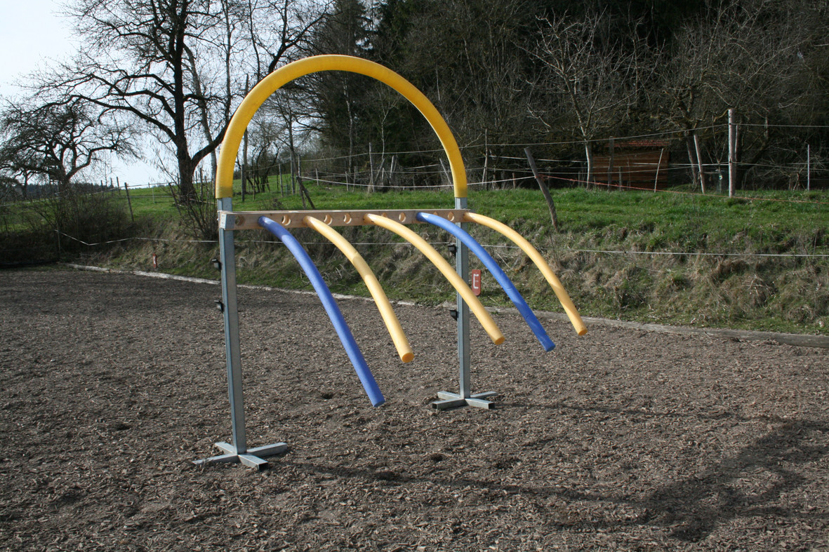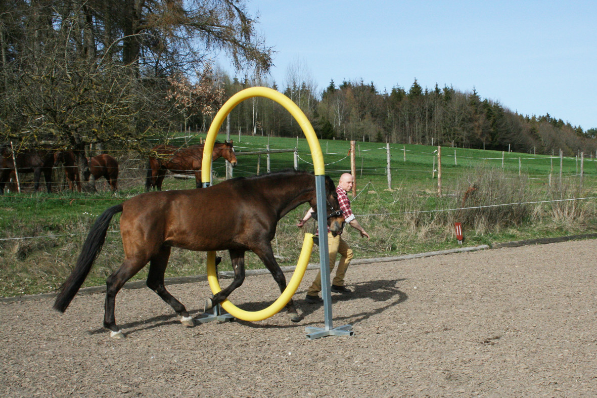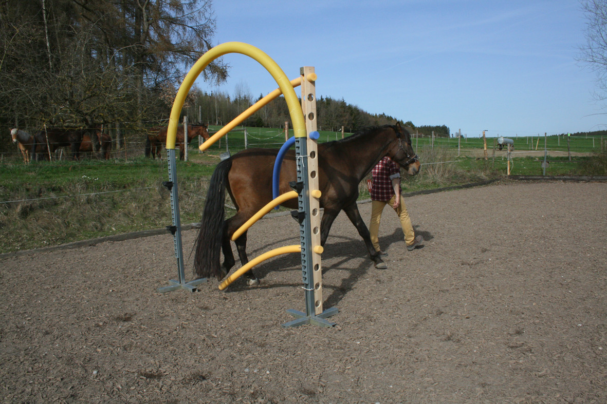 Bitte starten Sie aber langsam und beginnen Sie z.B. erst einmal nur mit dem Rohr am Boden liegend. Dann vielleicht  nur mit dem unteren Ring oder dem oberen Ring. Später, wenn das Pferd sicher ist, kann man den unteren Ring etwas höher hängen und wer sich dann noch traut auf dem Pferd durchspringen.