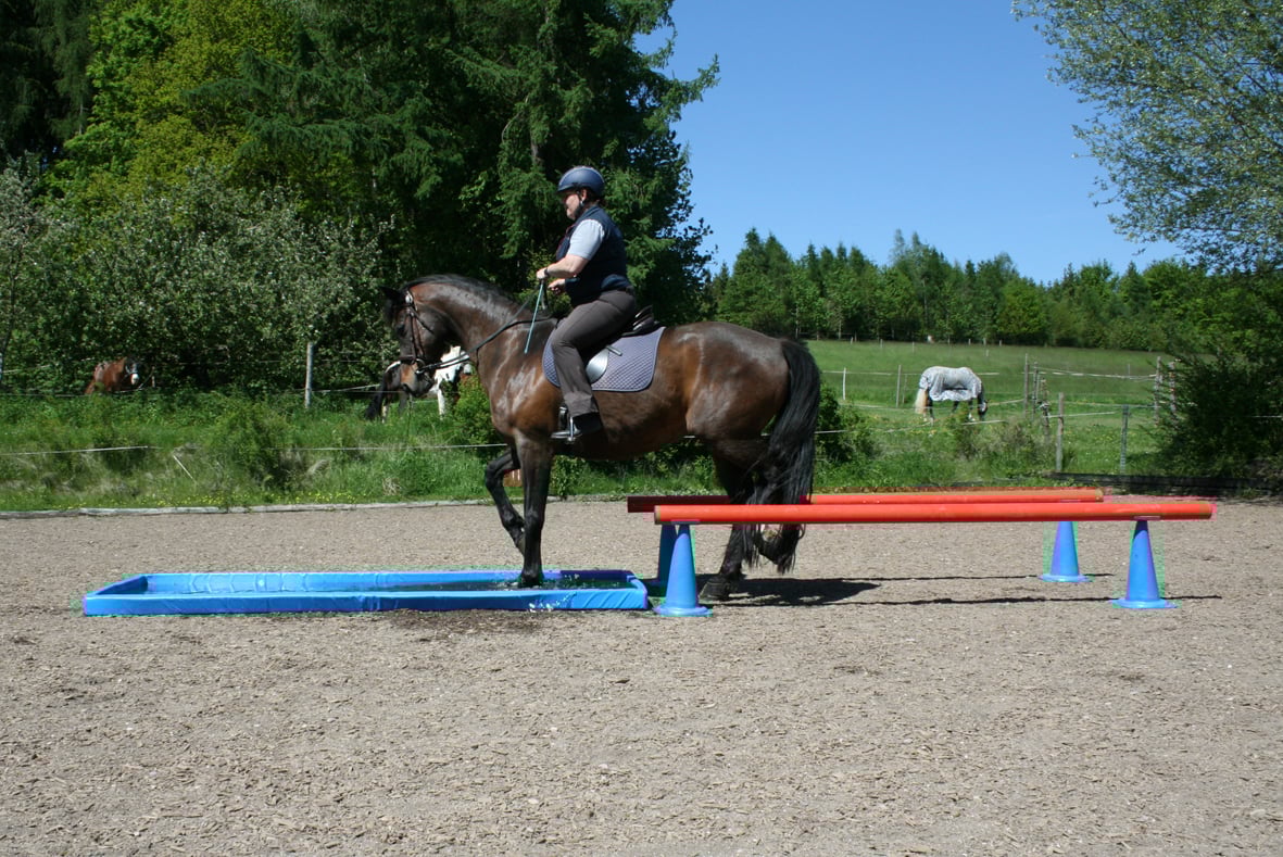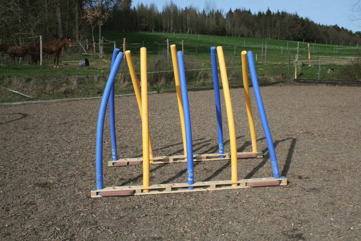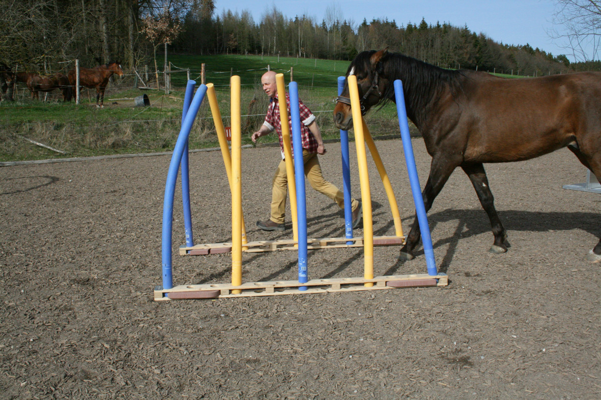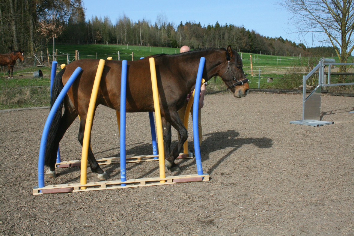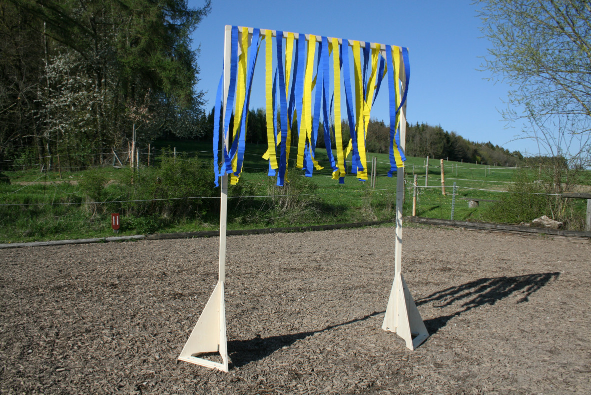 Bitte starten Sie aber langsam und beginnen Sie z.B. erst einmal nur mit dem Rohr am Boden liegend. Dann vielleicht  nur mit dem unteren Ring oder dem oberen Ring. Später, wenn das Pferd sicher ist, kann man den unteren Ring etwas höher hängen und wer sich dann noch traut auf dem Pferd durchspringen.