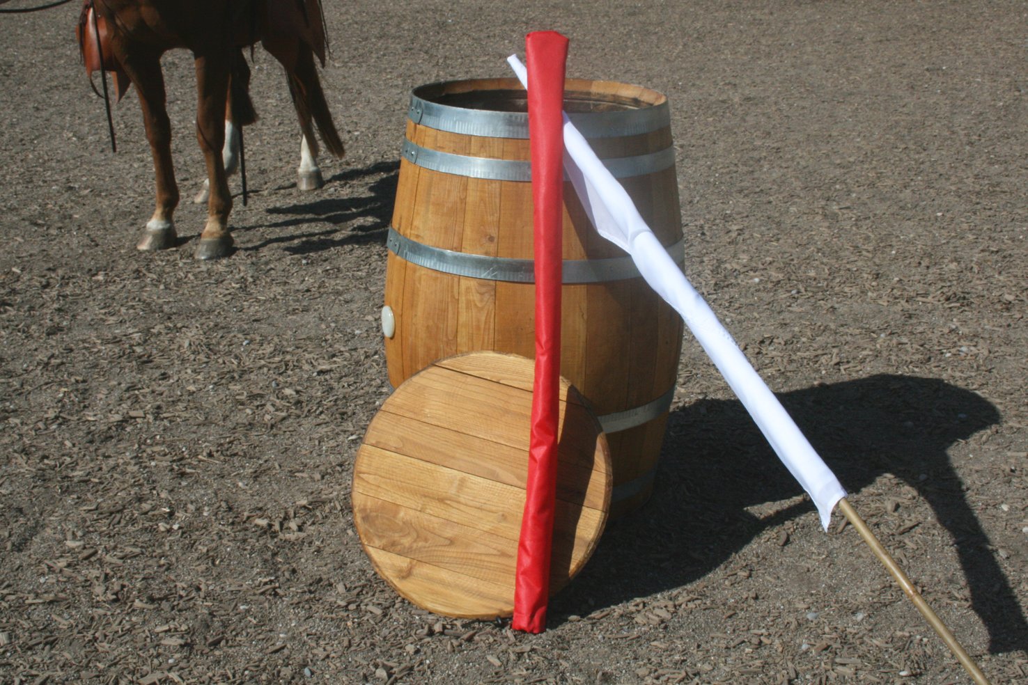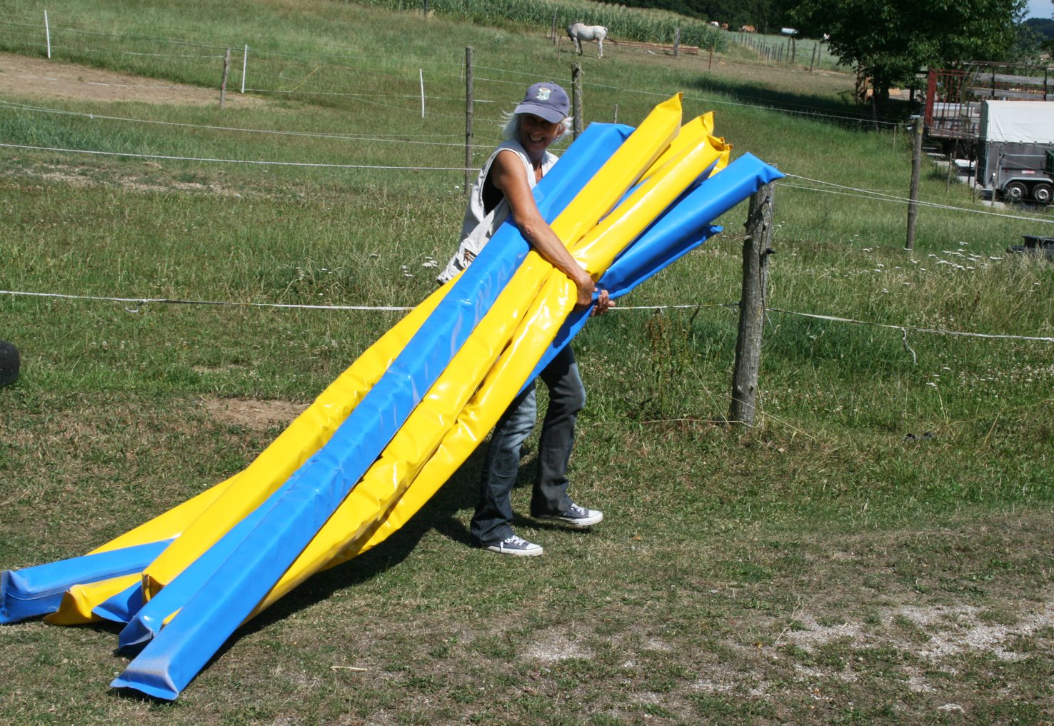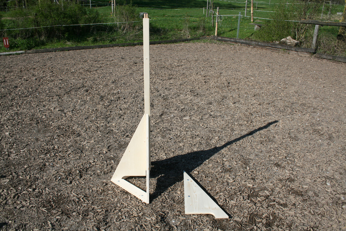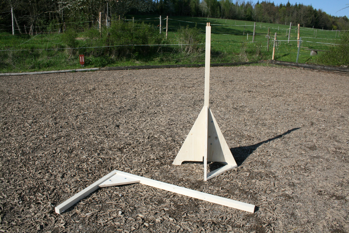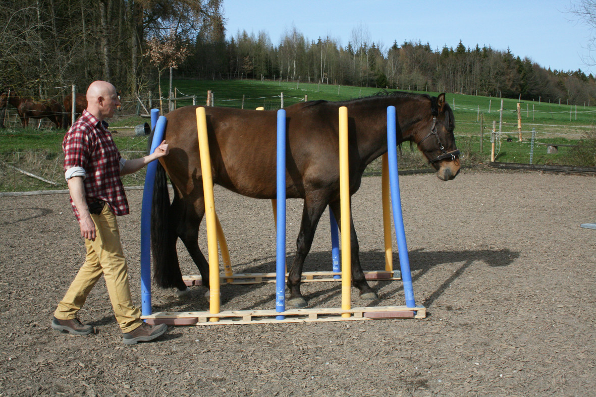 Bitte starten Sie aber langsam und beginnen Sie z.B. erst einmal nur mit dem Rohr am Boden liegend. Dann vielleicht  nur mit dem unteren Ring oder dem oberen Ring. Später, wenn das Pferd sicher ist, kann man den unteren Ring etwas höher hängen und wer sich dann noch traut auf dem Pferd durchspringen.