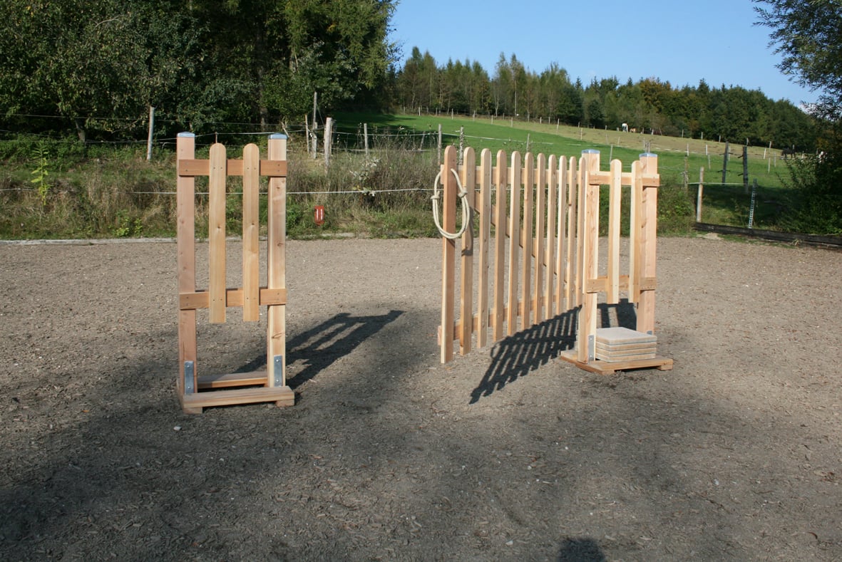 Das Tor hat eine Breite von 200cm. Geschlossen wird es mit einem Seil, das man über den Pfosten einhängt.