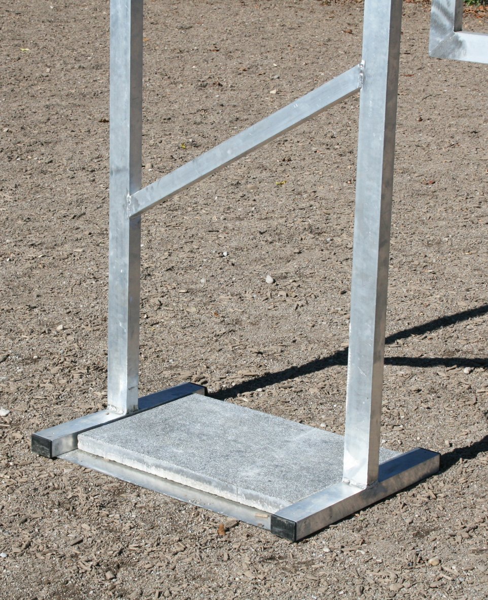 Bestehend aus 2 stabilen Metallfüßen die mit Steinplatten beschwert werden. 2 Senkrechten Stehern und natürlich dem 2m breiten Tor mit praktischem Klappverschluss.
