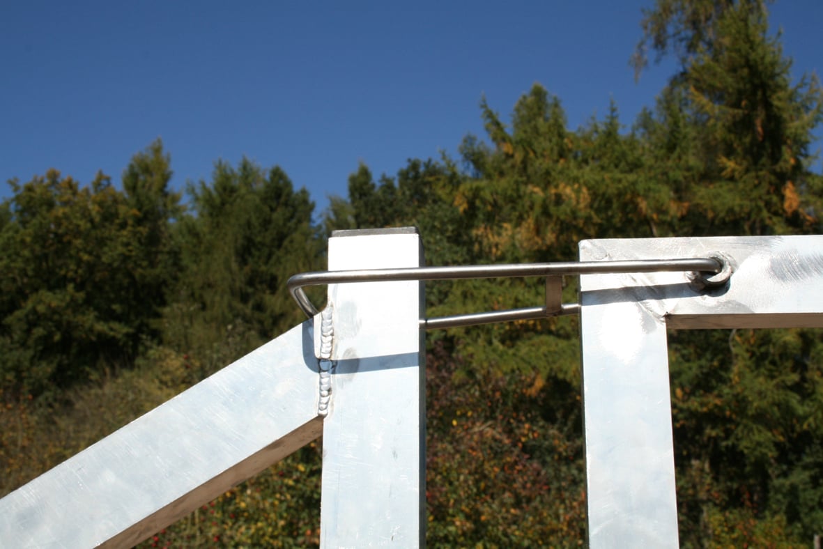 Der Verschluss des Tores ist kinderleicht zu bedienen. Er wird zum Öffnen einfach nach oben geklappt. An den Scharnieren ist das Tor zudem noch einmal extra verstärkt worden. Andere Hersteller machen das z.B. nicht bei ihren Alutoren.