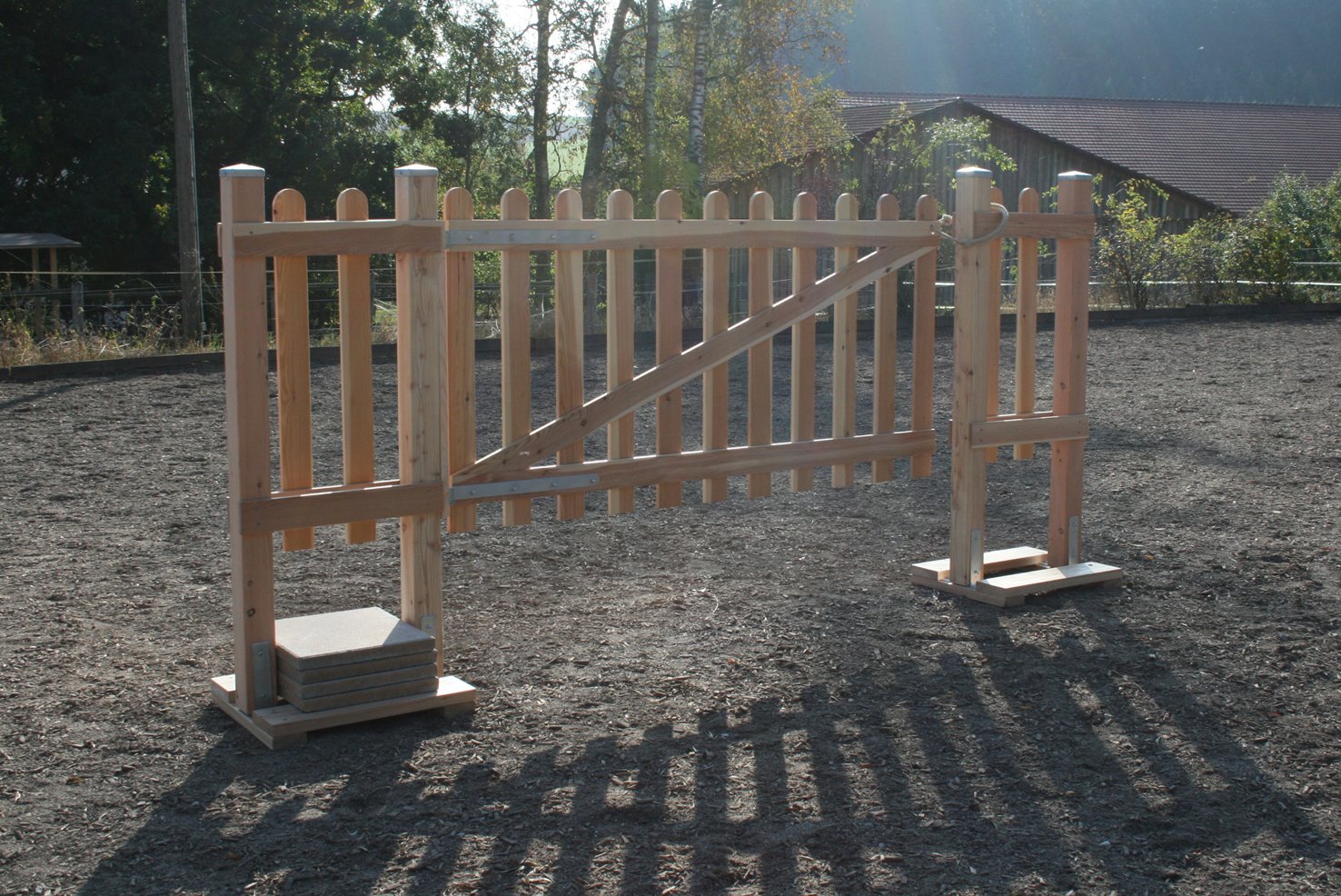 Damit das Tor auch wirklich stabil steht, eignen sich am besten Gehwegsplatten in einer Größe von 60cm x 40cm x 4cm. Eine Platte hat ein Gewicht von ca.20 kg. Wichtig, gerade auf der Seite die das schwenkbare Tor hält.