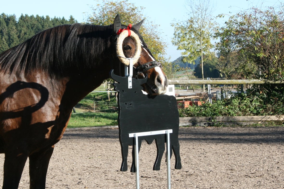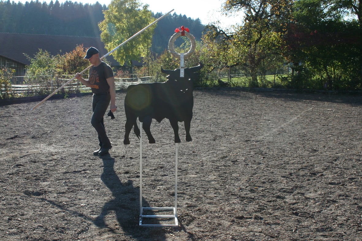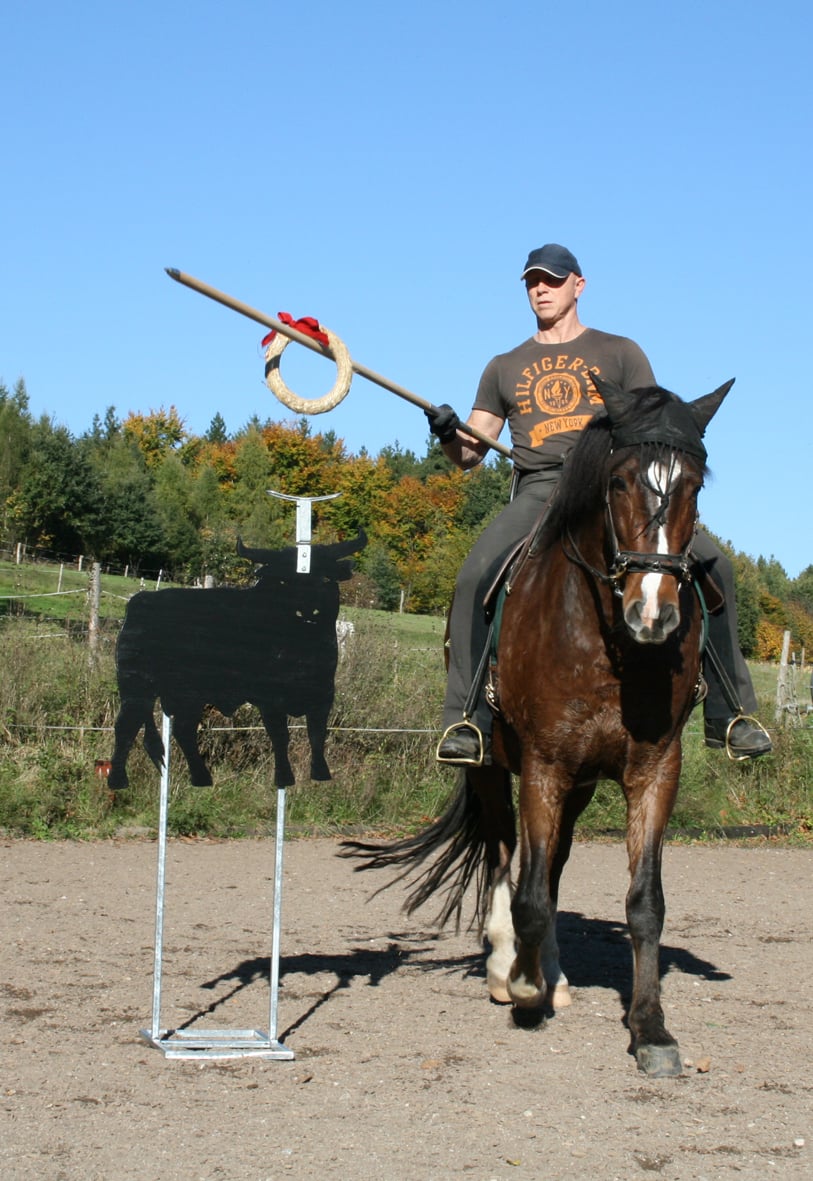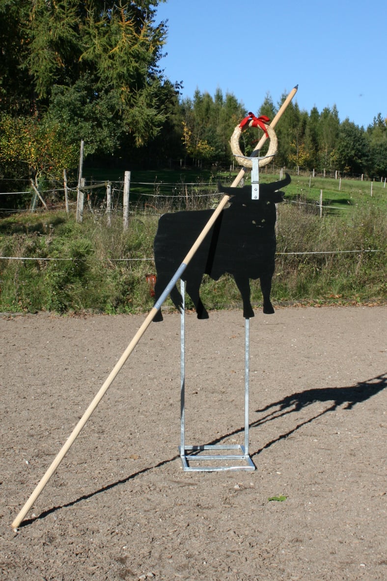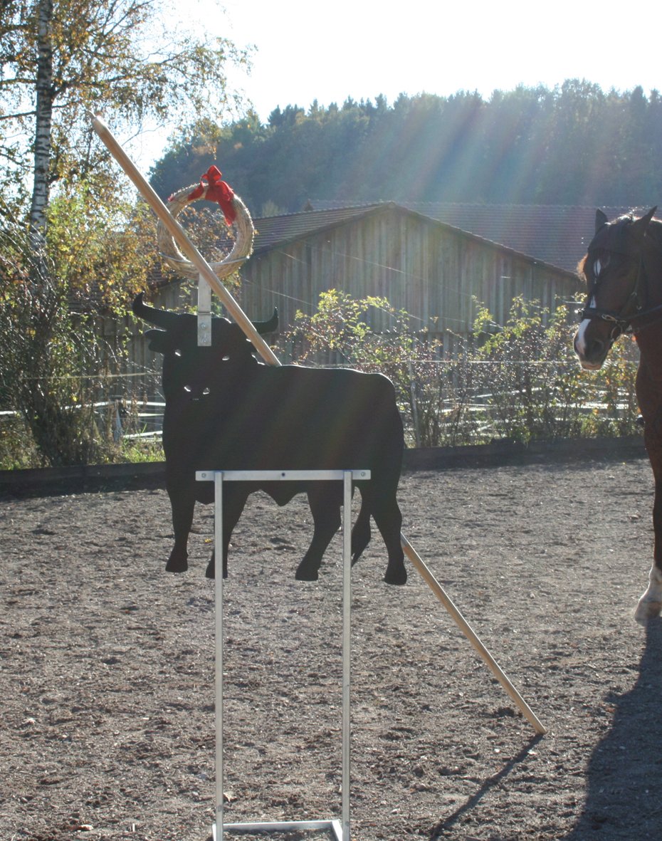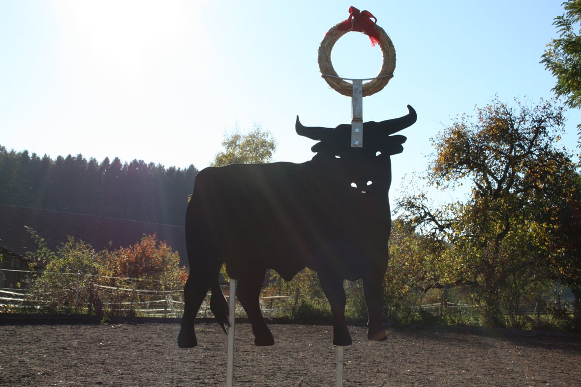 Auch kann die Halterung für den Strohkranz, jetzt ganz neu, im oberen Bereich zusätzlich gedreht werden. So können sie längs am Stier vorbeireiten oder aber frontal darauf zu.