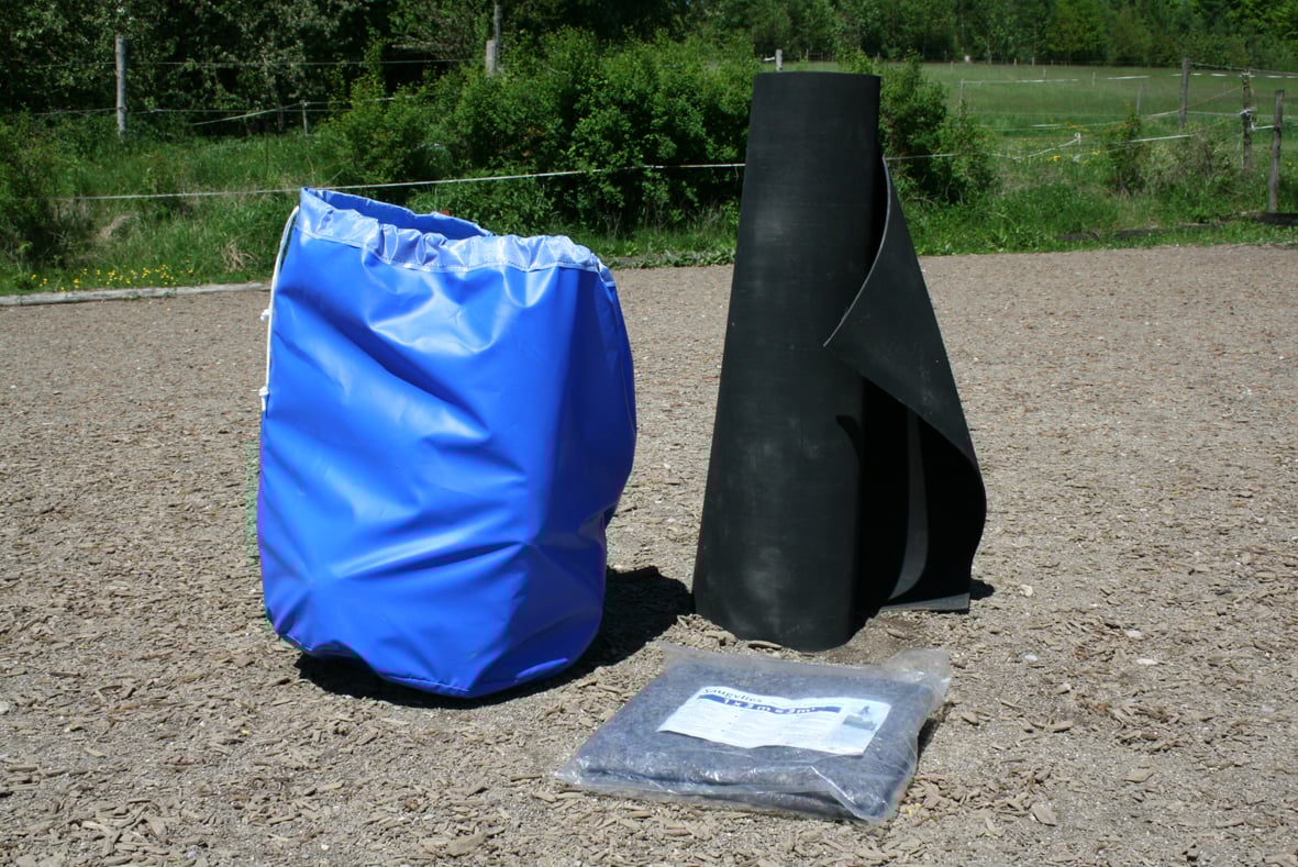 Er besteht aus einem 3-er Set:  Wassergraben mit Verwahrungssack, Gummimatte und Vlies.