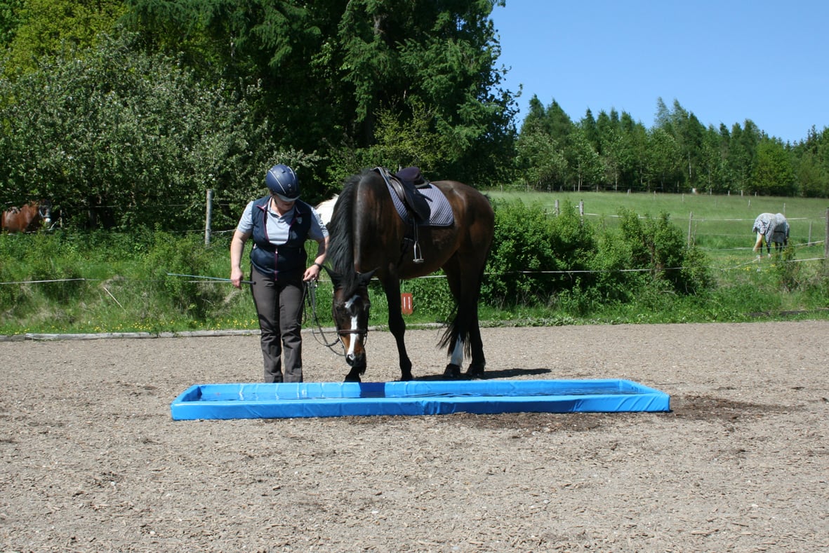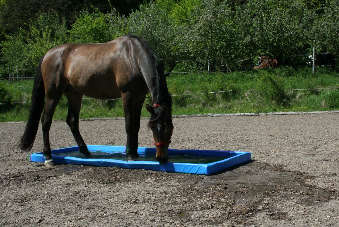 Wobei der Boden möglichst eben und ohne spitze Steine sein sollte. Dann den Wassergraben auf das Vlies legen und zum Schluss, um den Boden des Beckens trittfest und absolut rutschfest zu machen, unsere Gummimatte mit Gewebeeinlage. Da rutscht nichts mehr und alles ist absolut sicher.